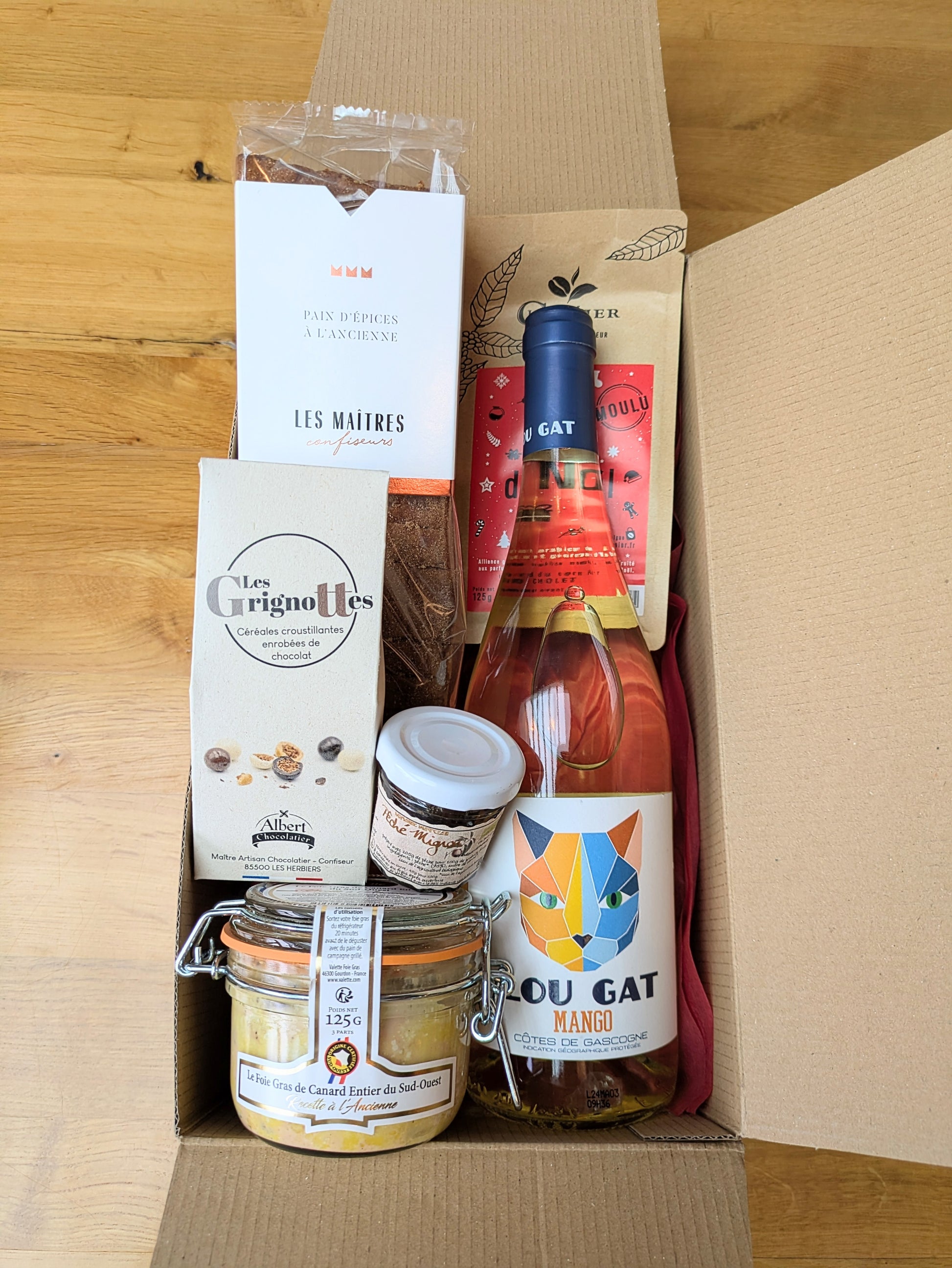 Un coffret aux saveurs des fêtes composé de foie gras, de pain d’épices, de billes chocolatées croquantes, d’un café de Noël, d’un petit pot de confiture et d’une bouteille de vin blanc moelleux.